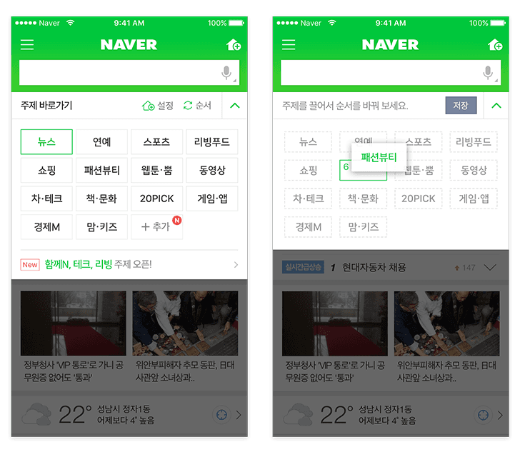 I redesigned NAVER’s search and news app across mobile, web, and widget surfaces, improving personalization and discovery for 30M+ monthly users. I defined key interaction patterns, including a new multi-menu editing/navigation model.