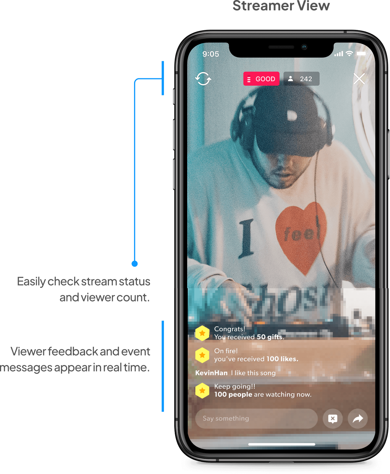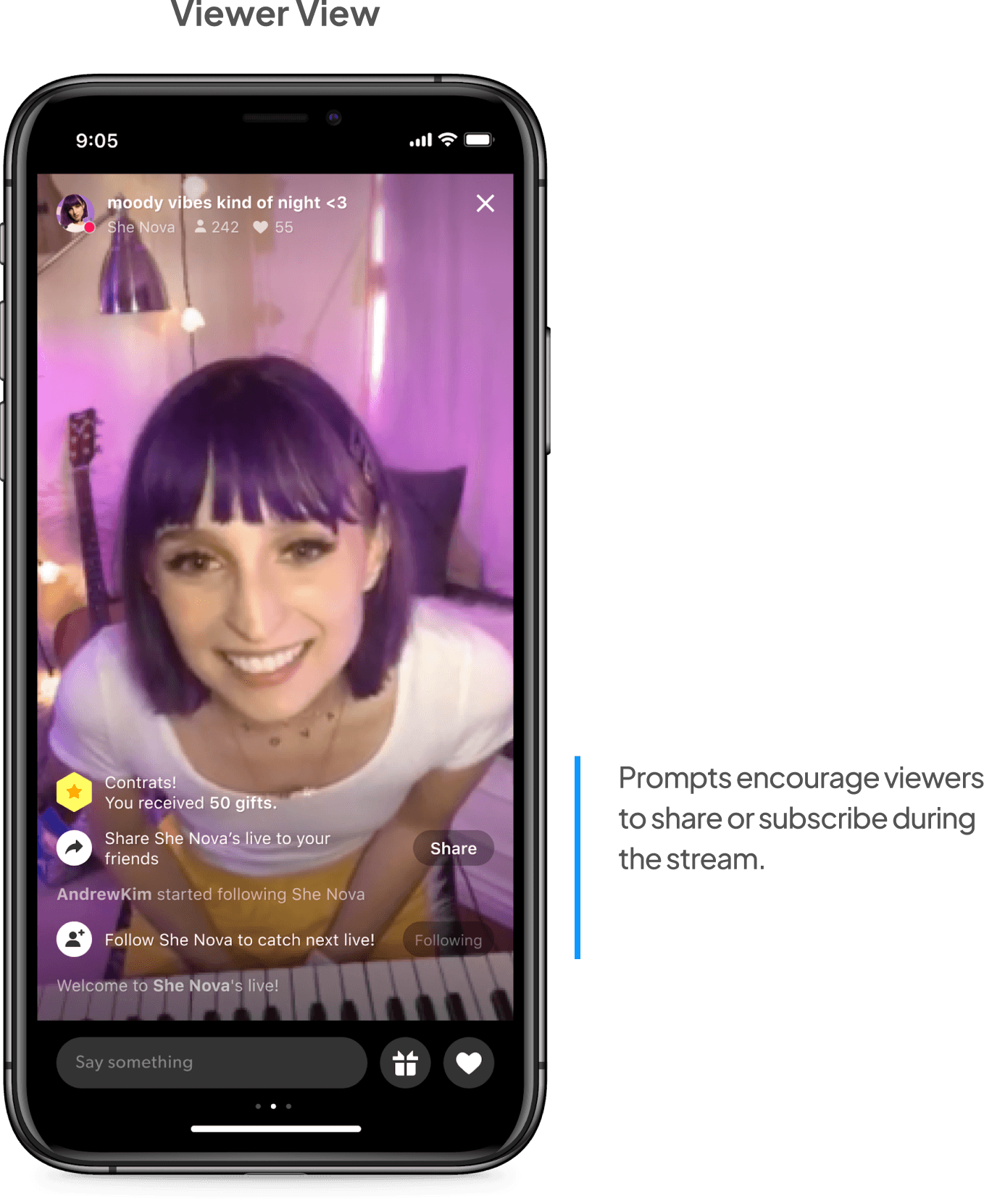 We refined the streamer interface so creators could monitor viewer feedback and stream information more easily on a small mobile screen. To encourage engagement, we also designed event messages and reactions that prompt viewers to interact during live streams.