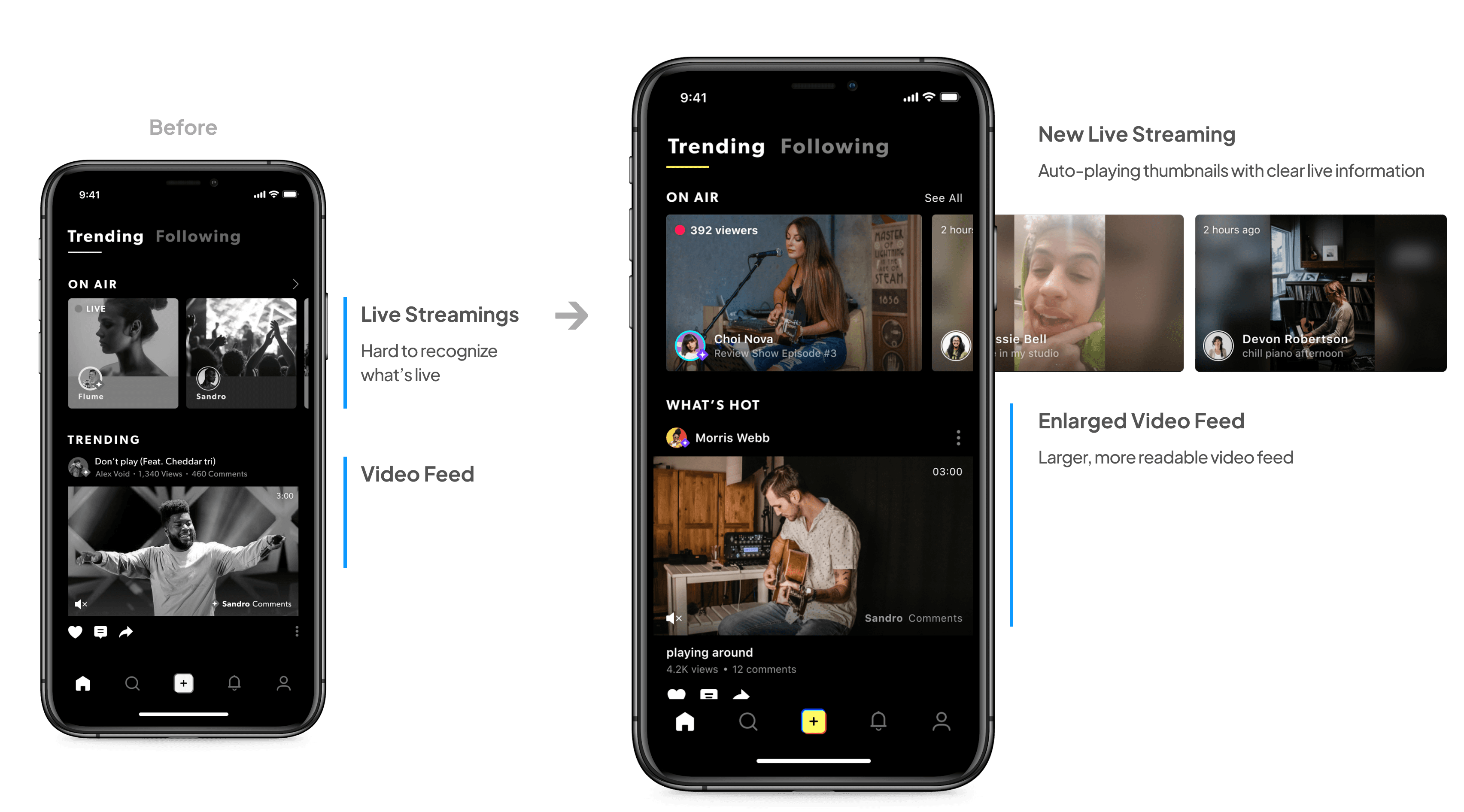 We improved the mobile home by making live content more noticeable and easier to browse. Live thumbnails now auto-play with clearer stream information, and feed videos appear larger and more readable.